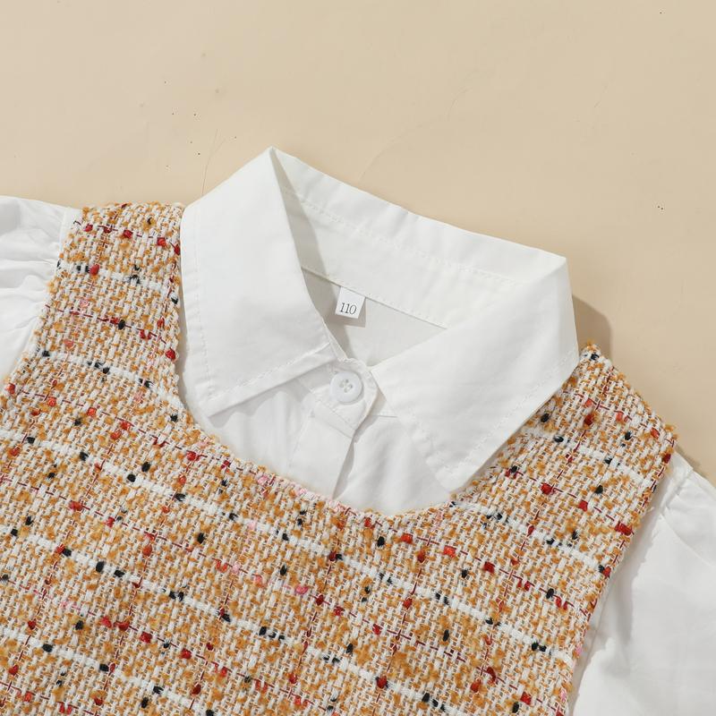 Cute and comfy solid colored polo shirt with plaid print vest and skirt.